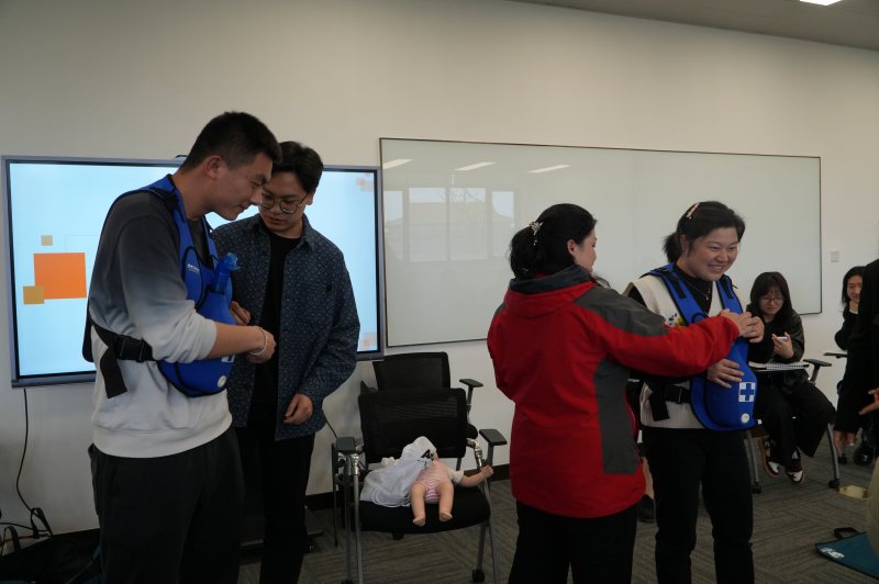“手把手”教學模式下,大家個個爭先恐后,積極投入到各項急救技能的學習中。有人躍躍欲試地學習心肺復蘇(CPR)的正確姿勢與注意要點,有人認真學習著如何快速有效地處理氣道異物梗阻。在笑聲與掌聲中,學習氛圍變得越來越熱烈,仿佛每個人都沉浸在一場急救技能的“洗禮”中。